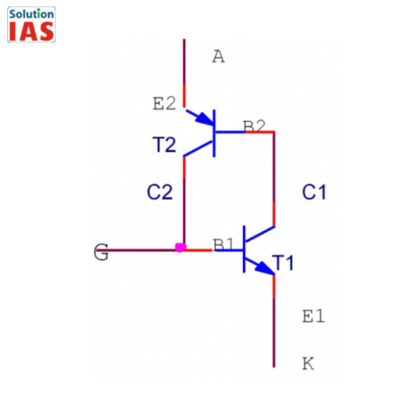 Thyristor được ghép từ 2 transistor có chiều đối nghịch và có thể điều khiển. Với 3 cực hoạt động là anode (A), cathode (K), cực điều khiển (G). Chúng hoạt động với vai trò tựa như một khóa điện tử có thể điều khiển, chúng được cấp điện và tự động ngắt khi trở về trạng thái ngưng dẫn khi không có điện. Lúc này điện được dẫn từ Anot sang Katot và kích thích điện vào chân G.